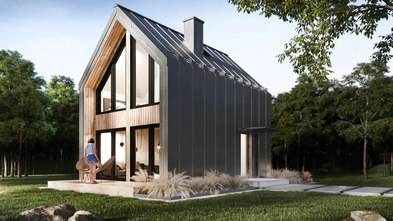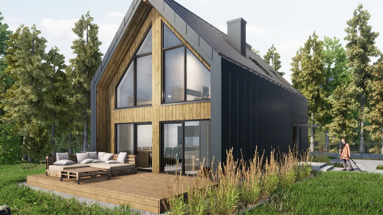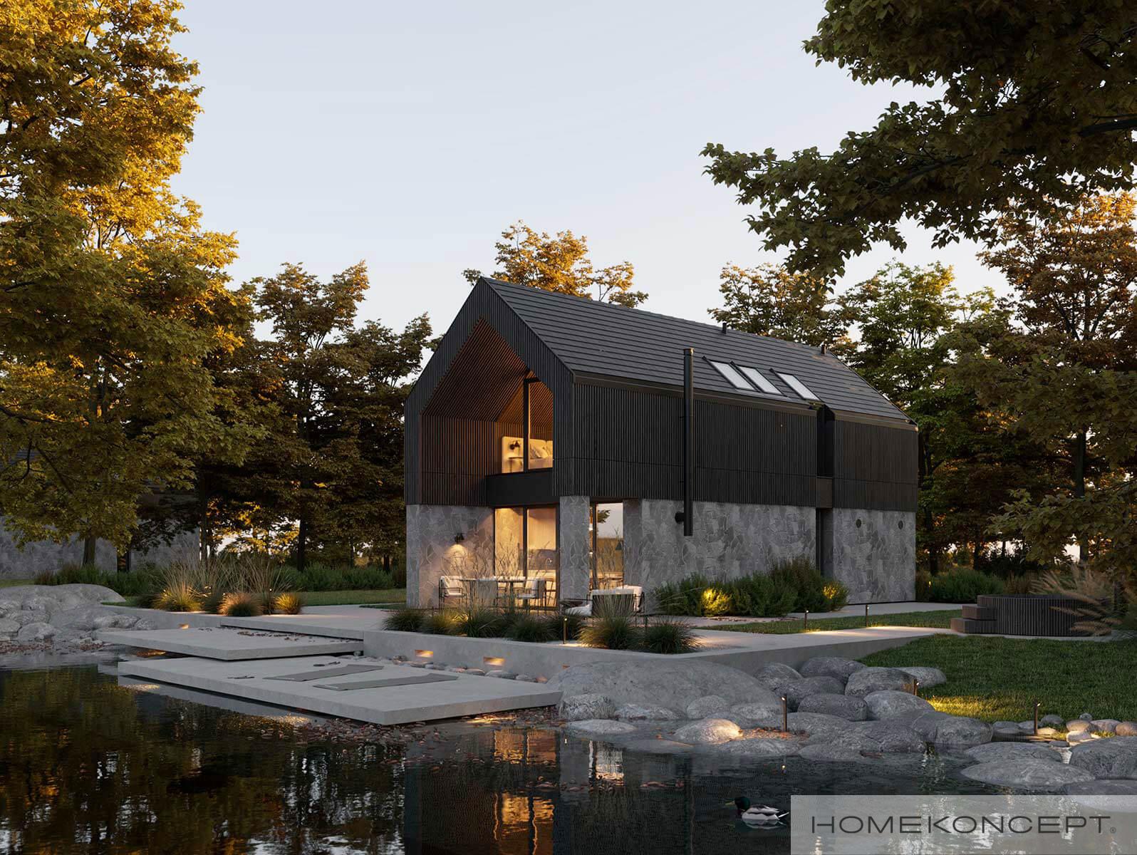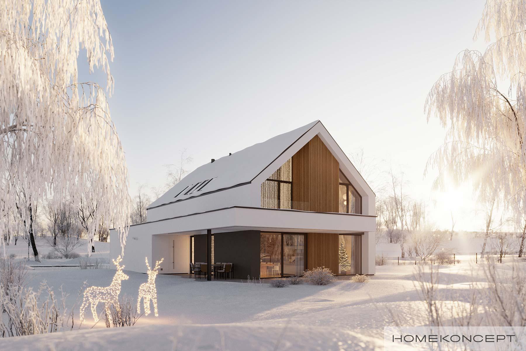 L-302 to propozycje niewielkiego, współczesnego domu z dwuspadowym dachem bez okapów. Elewację wykonano z drewna oraz ciemnego tynku. Wejście umieszczone na ścianie bocznej zadaszone dodatkowy daszek co stanowi atut w deszczowe lub śnieżne dni.